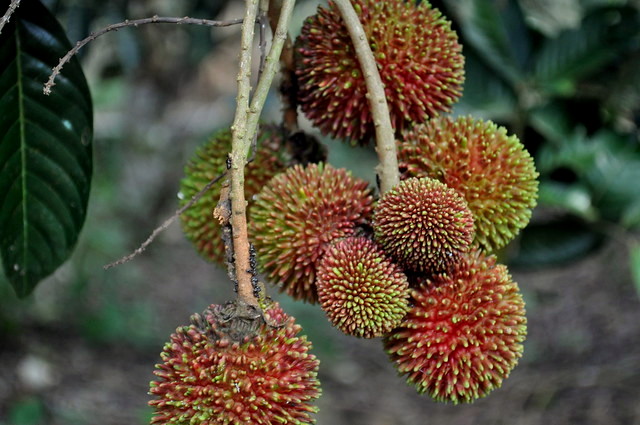 broadly ovoid, crimson to dark purple in colour with short blunt spines. The flesh of pulasan fruit is white to yellowish in